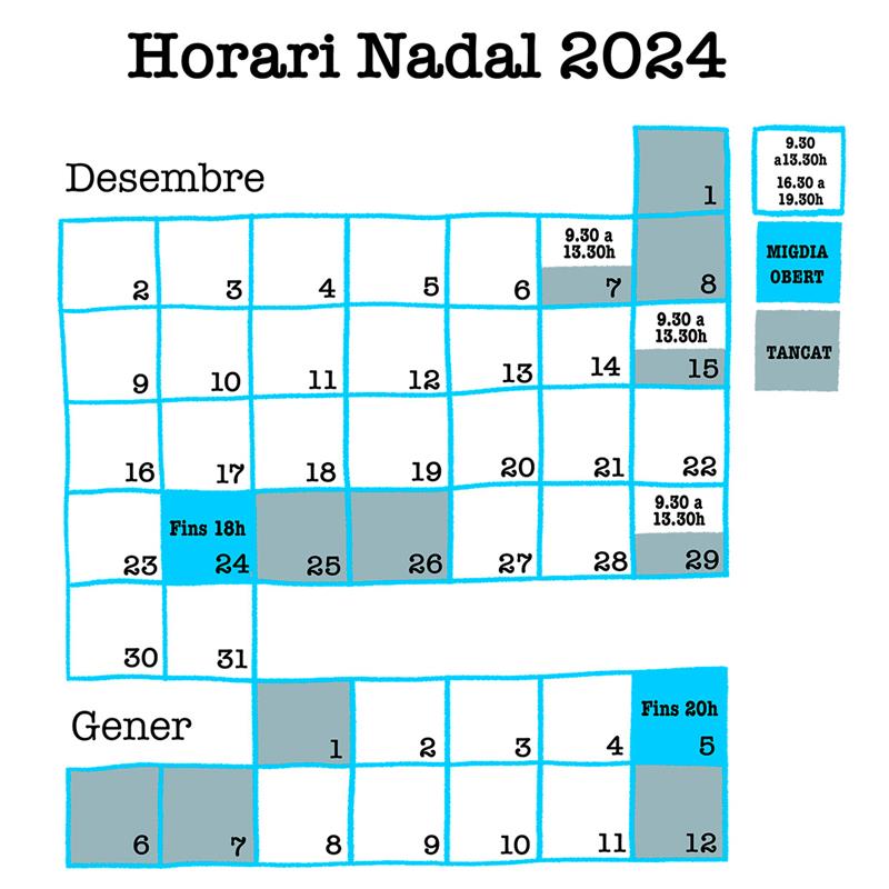 Trobareu obert el dia 6 de desembre així com alguns diumenges al matí. També tindrem migdia obert les jornades prèvies a Nadal i Reis. I qui, fins i tot així, no trobi un moment per venir a buscar lectura, també ho pot fer còmodament a través del nostre web on, a més d'enviament, també pot sol·licitar l'embolcallat dels productes (a la secció de comentaris).