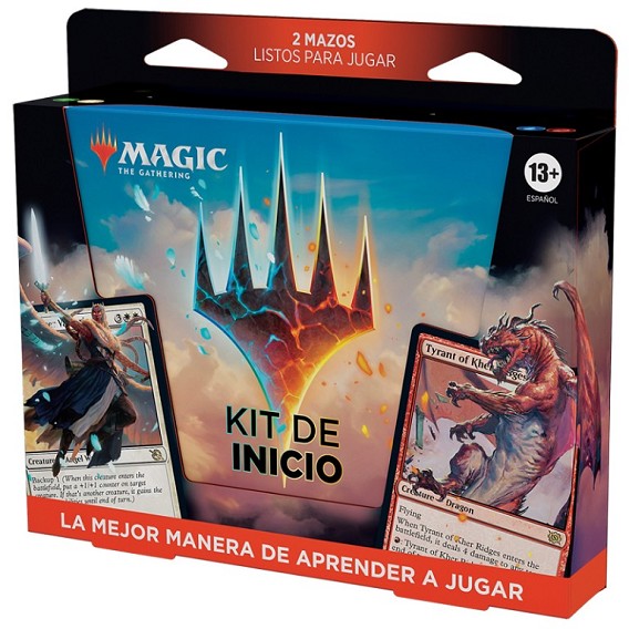 Aquí tienes todo lo que necesitas para disfrutar de tu primer juego de Magic: The Gathering. Aprende los fundamentos o enseña a jugar a tus amigos y familiares con la guía de juego y luego libra una batalla con los dos mazos preconstruidos de 60 cartas: Día del dragón (un mazo azul-rojo) y Agresión respaldada (un mazo verde-blanco). Cada mazo contiene dos cartas raras míticas y seis cartas raras, con 1 carta rara foil tradicional, con las que podrás inclinar la balanza a tu favor y empezar con fuerza tu colección. Este kit también incluye 2 tarjetas con códigos para que dos personas desbloqueen ambos mazos y jueguen con ellos en Magic: The Gathering Arena (disponible para móviles y PC). Cada mazo incluye una caja guardamazo, 2 fichas de dos caras y una tarjeta de referencia (orden del turno/atacar y bloquear).