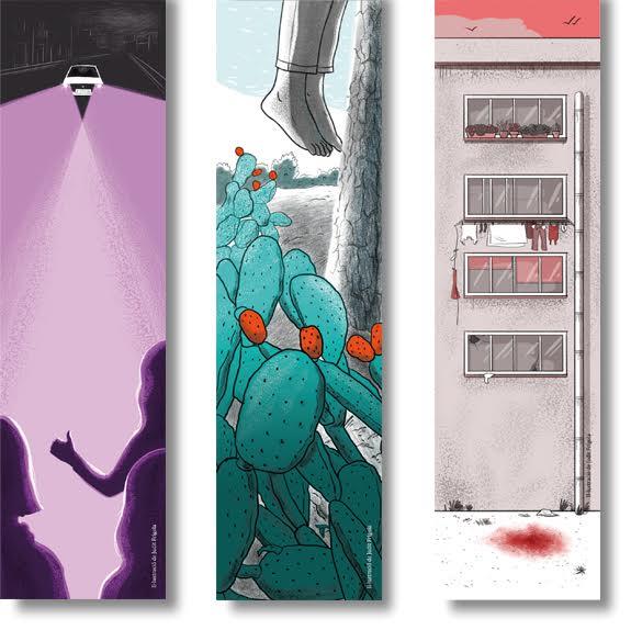 Pack de 3 punts de llibre il·lustrats per la il·lustradora Judit Frigola que ha fet una interpretació per recordar tres casos dels que es parlaran i s'analitzaran en la 2a edició del Festival Ceba Negra de Figueres.